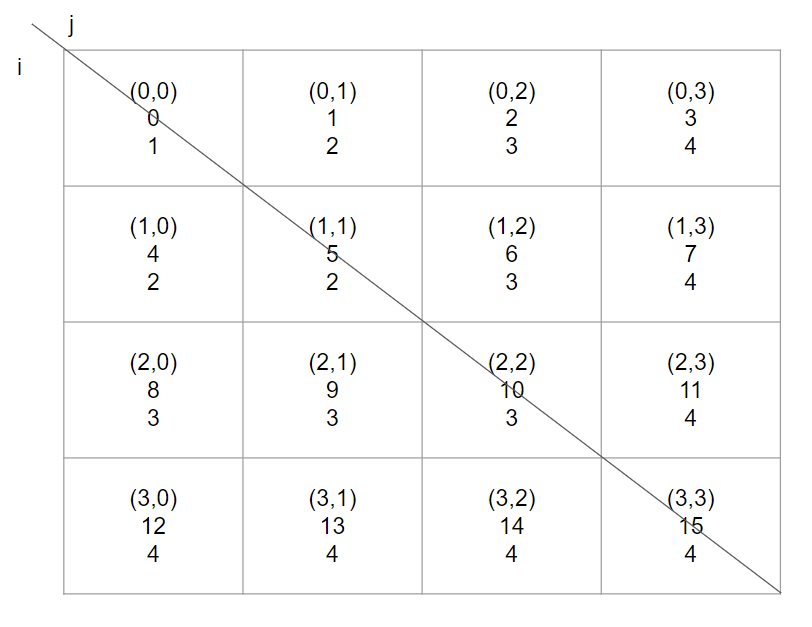 좌표를 통해 해당 값을 얻는 것은 i=j인 대각선을 기준으로 아래쪽은 i+1의 값, 위쪽은 j+1의 값을 가진 것을 알 수 있습니다.